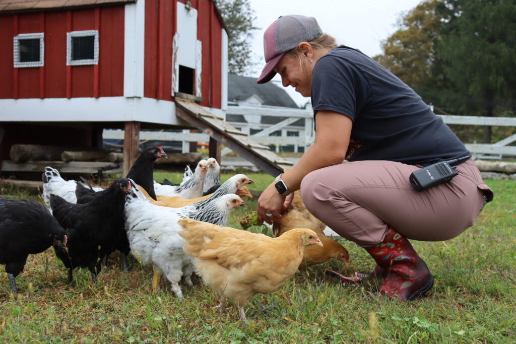 Farm staff conditioned the chickens to respond to the ding of a bell, signifying it’s time to leave the coop for treats and a walk. Several times a week, the chickens have the option to walk around the farm following a caretaker. They explore pecking here and there for worms under the watchful eye of humans. Each time the bell dings the flock regroups and resumes the walk until it is time to go back into the coop! There is no force, no chasing and no pressure, and the chickens follow willingly. Any hen not in the mood to join simply stays behind in the coop.
